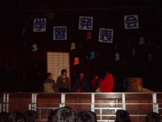 ![]() 学習発表会。わらぐつの中の神様の一場面。 |